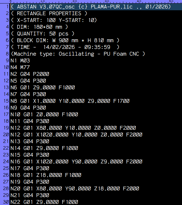prerequisites for machine: G 04 must be in mSec, blade rotating axis must be defined as Z, full rotation of axis must be scaled by 10 and defined as non-rotational (-36 to +36 degree for oscillating machine) G90,G91,G92 must be suported